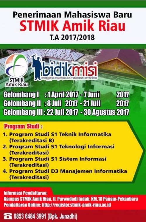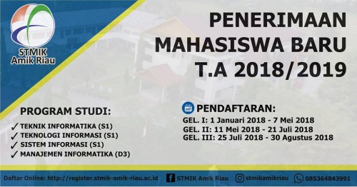 Pendaftaran Mahasiswa Baru STMIK Amik Riau Gel. III. Bagi adik-adik yang ingin melanjutkan studinya ke Perguruan Tinggi di bidang ilmu komputer, STMIK Amik Riau Pilihannya. Program Studi S1 Teknik InformatikaProgram Studi S1 Teknologi InformasiProgram Studi…...