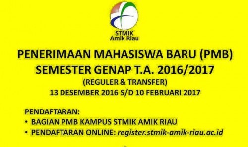 PORTAL RIAU/SUMUT - PEKANBARU - STMIK Amik Riau - Program Studi S1 Teknik Informatika (Terakreditasi B) - Program Studi D3 Manajemen Informatika (Terakreditasi) PENERIMAAN MAHASISWA BARU SEMESTER GENAP T.A 2016/2017…...