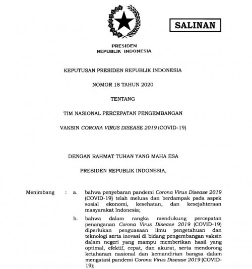 Portalriau.com-Jakarta.Pada 9 September 2020,Tangkapan layar Keppres Nomor 18 Tahun 2020 Presiden Joko Widodo (Jokowi) telah membentuk Tim Percepatan Pengembangan Vaksin Covid-19 berdasarkan Keputusan Presiden (Keppres) Republik Indonesia Nomor 18 Tahun 2020. Tautan: https://jdih.setkab.go.id/PUUdoc/176226/Keppres_Nomor_18_Tahun_2020.pdf. Sebelumnya…...