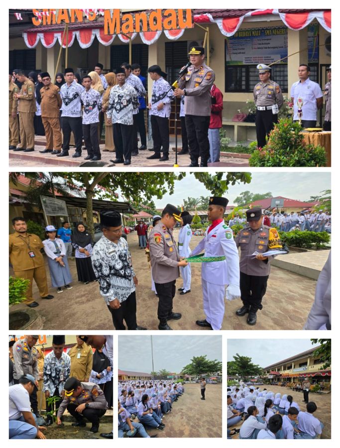 Mandau, --Portalriau.com-- Kapolsek Mandau Kompol Primadona, S.I.K, M.Si sebagai Pembina Upacara di SMAN 09 Mandau di Kelurahan Air jamban, Kecamatan Mandau, Kabupaten Bengkalis, pada Senin 25 Agustus 2025. Acara melaksanakan Grebek Sosialisasi melibatkan AKP Indra…...